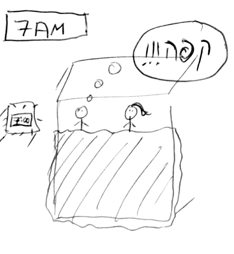 אחרי שבע שעות שינה בלילה, אתה קם עם כל כך הרבה אדונזין שנכנס בקלות לקולטנים המרובים, שכבר קצת כואב לך הראש. אתה לא רוצה לדבר, אתה עייף מת. אתה מרגיש חרא, ואתה יודע טוב מאד שמה שיפתור את זה – זה הקפה.