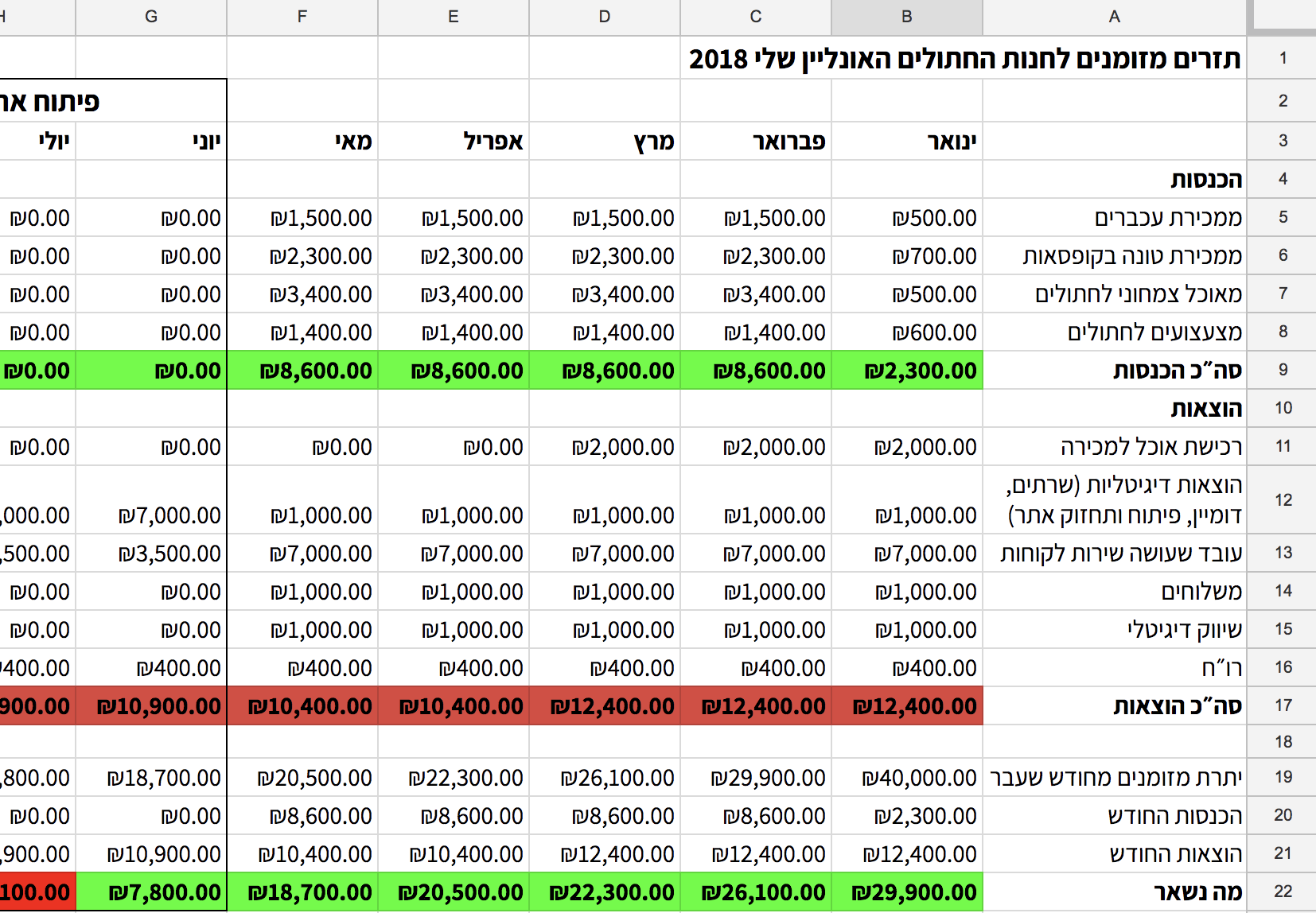 שימו לב – הקובץ נשאר פשטני בכוונה, כדי שלא תיבהלו. אבל כדאי עם הזמן להכניס אליו גם את המיסים שאתם משלמים כל חודש, ביטוח לאומי, ושאר הוצאות משתנות וחד-פעמיות כמו שדרוג האתר לדוגמא. (ותודה לאלון אלפרוביץ׳ שהעיר את תשומת לבי).
