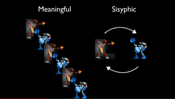 מה קרה בתכל׳ס? בקבוצה המשמעותית בנה הסטודנט בממוצע אחד-עשר רובוטים, לעומת רק שבעה בקבוצה הסיזיפית. הבדל של 40% – וזאת למרות שהכסף שהתקבל לכל רובוט נוסף הלך וקטן – מה שמוכיח עוד יותר שהמשמעות – קטנה ככל שתהיה – שנבעה רק מלהסתכל על ערמת הרובוטים שלך גדלה – היא זו שנתנה את המוטביציה.