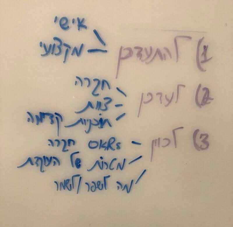 1. רבע שעה פלוס – העובד מדבר על מה שבא לו זה יכול לזוז מקבוצת הכדור רגל שלו ועד למשימה הנוכחית 2. פידבק שלך על השבוע שלו