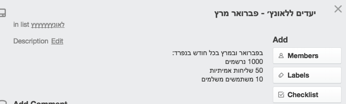 הנה המדדים ששמנו לעצמנו להשקה הזו – שבעצם תמשך במשך חודשיים. יש לי המון אתרים שהבטיחו לפרסם את פרוספרו, לאט לאט, לא צריך הכל ביום אחד. אז רצינו בכל אחד מהחודשיים הקרובים להגיע ל-1000 נרשמים, 50 שליחות אמיתיות של הצעות מחיר דרך המערכת, ו-10 משתמשים משלמים.