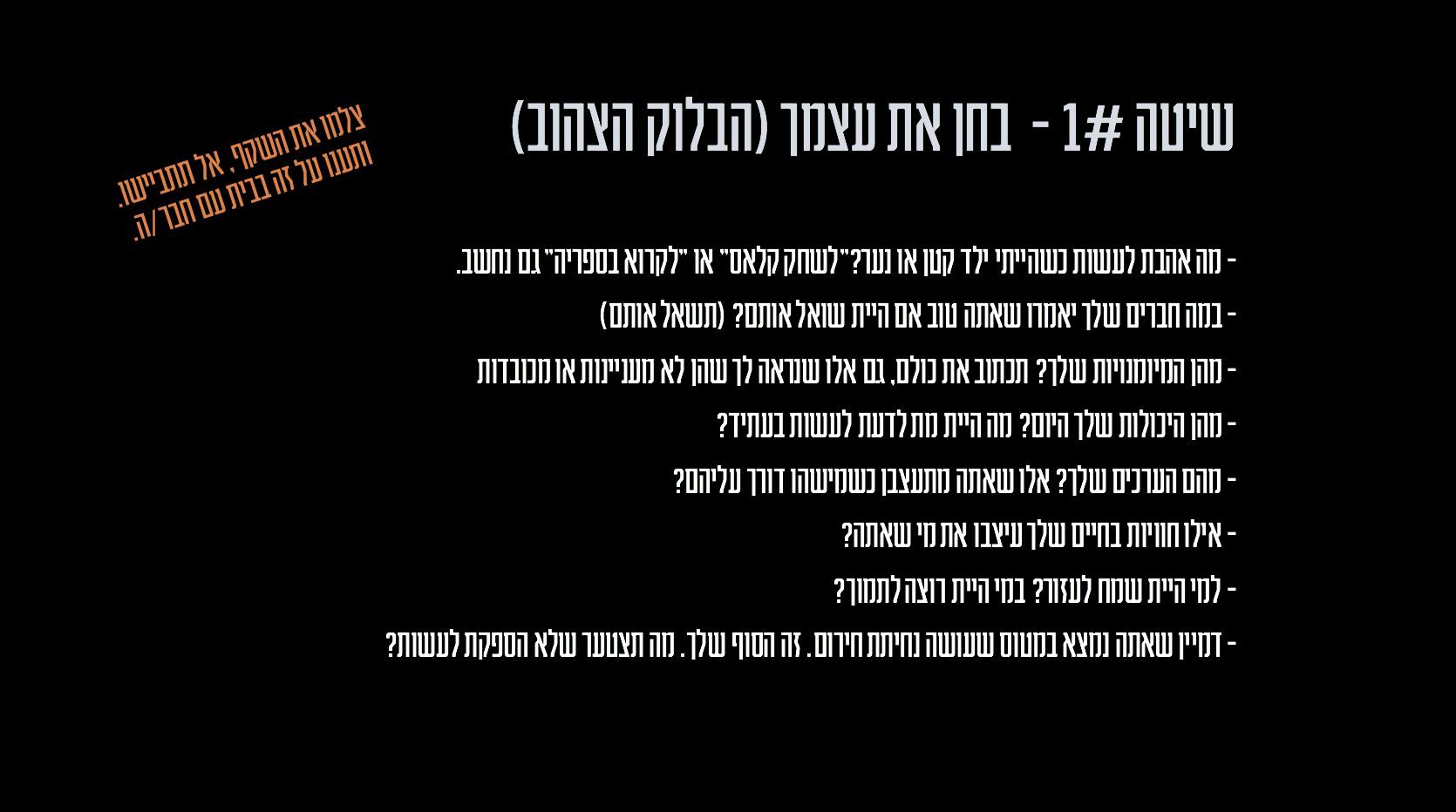 הנה חוב מהפרק – ״הבלוק הצהוב״ – שקף מתוך ההרצאה שלי שהיא בעצם היישר מתוך הספר ״אני רוצה הכל״